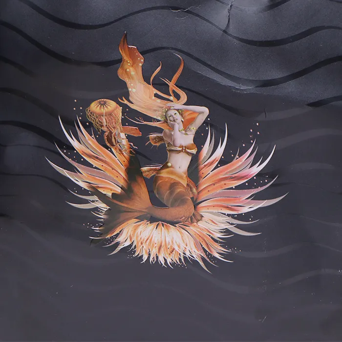 O: Postopek logotipa združuje barvno tiskanje z vtiskovanjem. To poveča tridimenzionalnost in doda bogastvo barvitemu vzorcu ali logotipu v luksuznih nakupovalnih torbah. Logotipi s svojimi bogatimi barvami so natisnjeni tako, da prikažejo visoko nasičenost, nato pa se z vtiskovanjem delno dvigne površina papirja, kar ustvari tridimenzionalni taktilni in vizualni učinek.