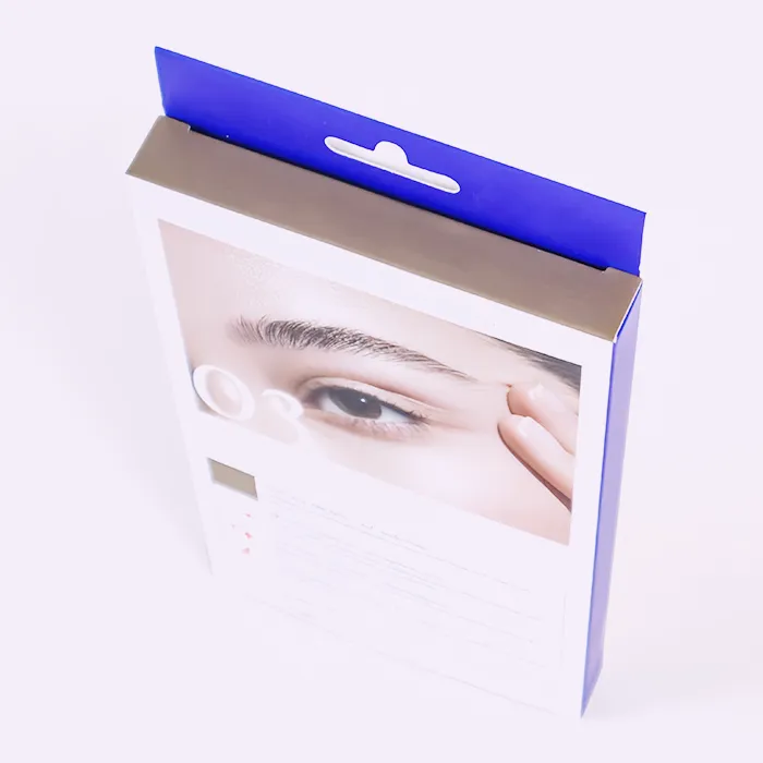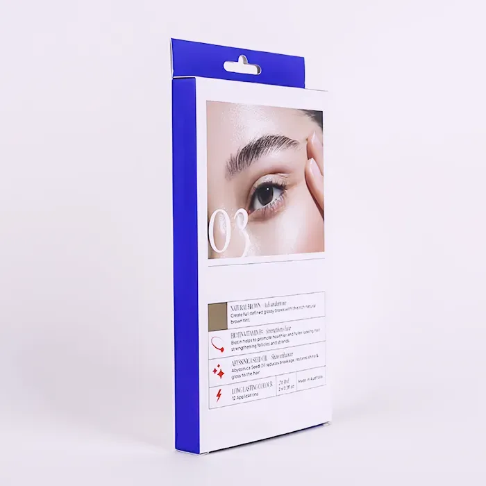 Te natisnjene škatle z obesnimi zavihki je oblikoval in izdelal Doyoupacks za blagovno znamko Market Beauty, ki je močno prisotna v maloprodajnih kanalih množičnega trga. Ko je naša tovarna sprva oblikovala strukturo embalaže, smo upoštevali njene prodajne scenarije, izdelek v notranjosti pa je pisalo za barvanje obrvi. Viseče maloprodajne škatle po meri so najprimernejši izbor, saj so primerne za razstavljanje obešenih na kavelj v maloprodajnih verigah, vključno z drogerijami in lepotnimi trgovinami. Poleg tega sta zaradi stabilne nosilnosti in zasnove odprtine z dvojnim koncem idealna za pakiranje lahkih kompletov z več predmeti, kot so pisala za barvanje obrvi.